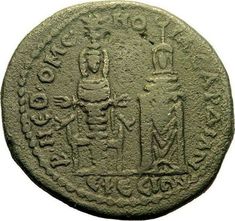 to left, cult statue of Artemis of Ephesus standing, facing, wearing kalathos, having supports; between two stags; to right, cult statue of Kore of Sardis standing, facing, wearing tall crown surmounted by crescent