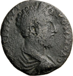 laureate-headed bust of Commodus (long and wide beard) wearing cuirass and paludamentum, right, seen from rear