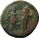 to left, Isis standing, right, holding sistrum and situla; to right, Sarapis standing, left, holding long sceptre
