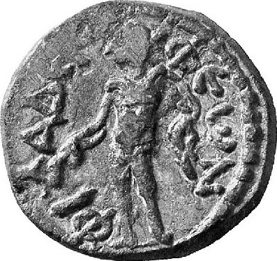 nude male figure (Apollo or Hermes?) standing, facing, head, left, holding uncertain object (laurel branch or caduceus) and chlamys