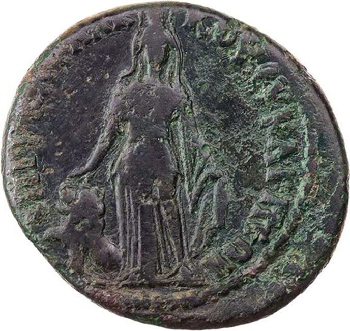 cult statue of Cybele standing, facing, wearing kalathos, placing right hand on lion seated beside her |