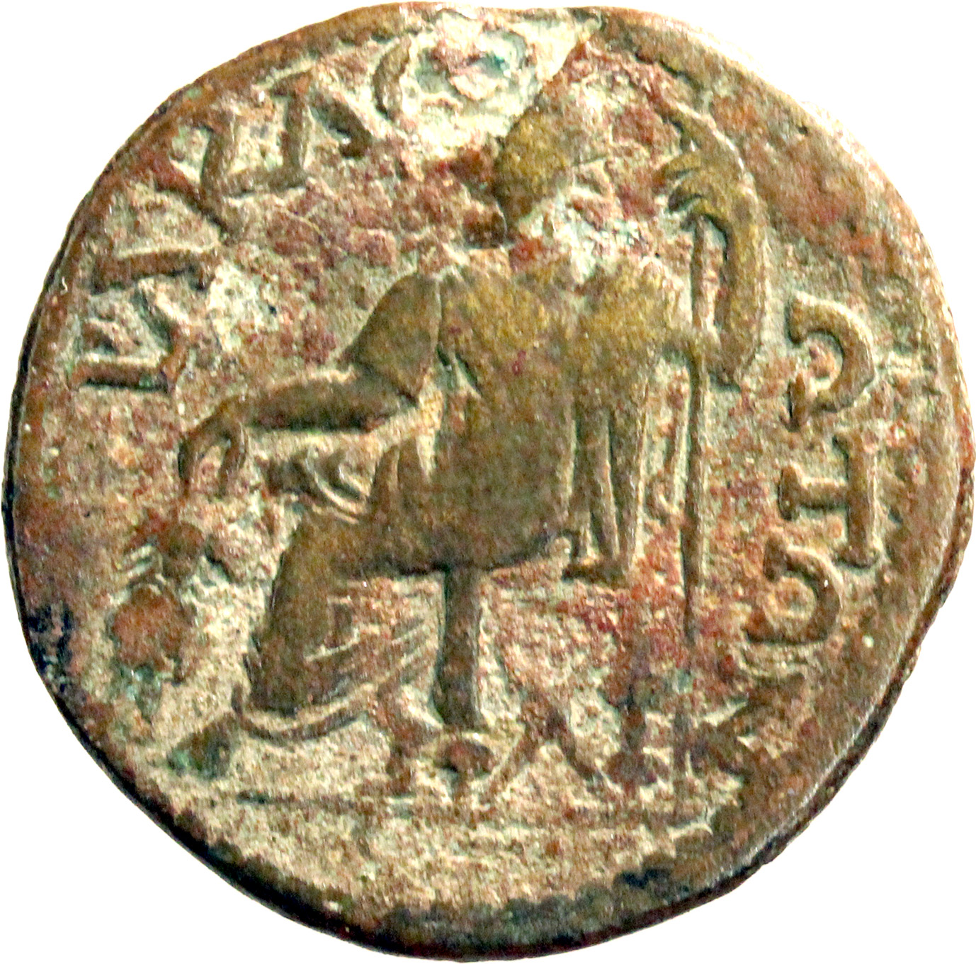 Sarapis seated, left, wearing kalathos, feeding Cerberus from patera, holding long sceptre