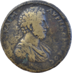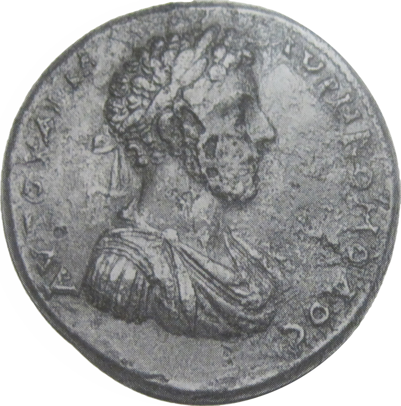 laureate-headed bust of Commodus (short beard) wearing cuirass and paludamentum, right, seen from front