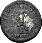 Faustina II as Fecunditas standing, facing, head, right, carrying infant imperial twins (Commodus and T. Aurelius Fulvus Antoninus); on either side, her four other children