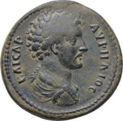 bare-headed bust of Marcus Aurelius (lightly bearded) wearing paludamentum, right, seen from rear
