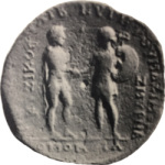 to left, hero Kyzikos standing, right, chlamys over shoulder, holding spear; to right, Amazon Smyrna standing, left, holding holding double axe and pelta; both clasping hands |