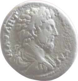 in centre, cult statue of Artemis of Ephesus standing, facing, wearing kalathos, having supports; between two stags; between two emperors (Marcus Aurelius and Lucius Verus) standing, facing each other, each wearing toga and holding patera |