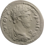 Obverse design laureate-headed bust of Commodus (short beard) wearing cuirass and paludamentum, right, seen from rear