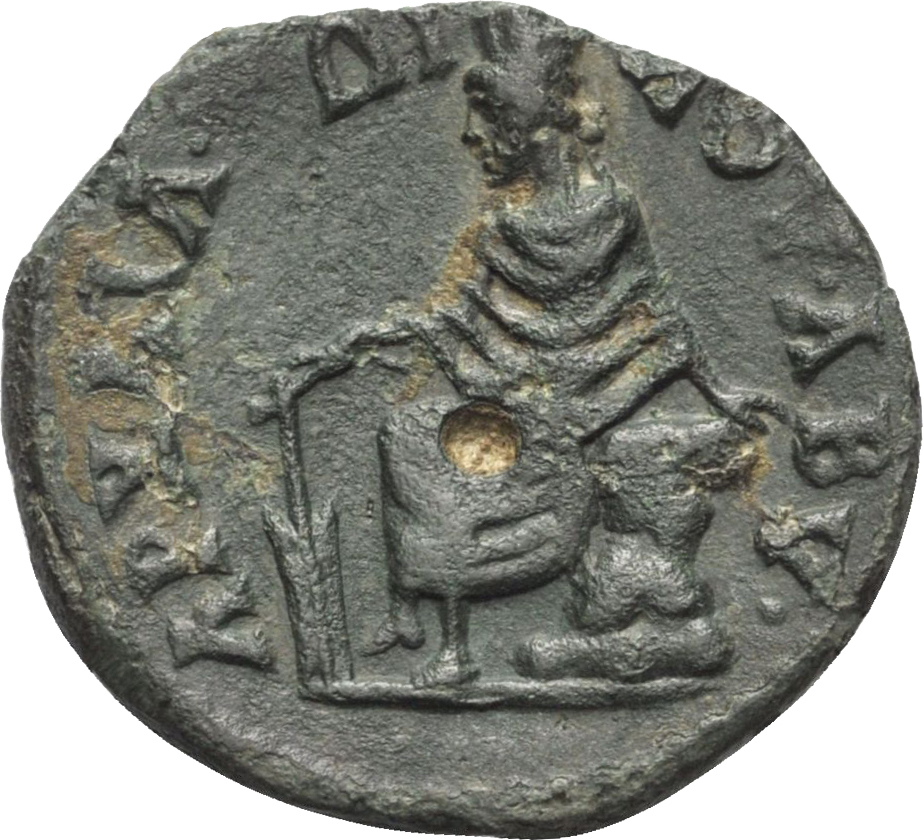 turreted Tyche seated on rock, left, holding rudder, resting left arm on rock