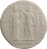 to left, Homonoia(?) standing, facing, head, left, holding patera and cornucopia; to right, Nike standing, left, crowning Homonoia
