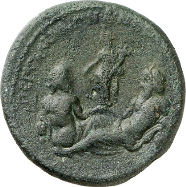 in centre in background, Tyche standing, holding rudder and cornucopia; before, the two river-gods Ketios and Seleinous reclining, facing each other, each resting on water-urn |