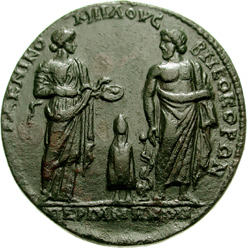 to left, Hygieia standing, right, feeding serpent from patera; to right, Asclepius standing, facing, head, left, holding serpent-staff; between, Telesphorus standing, facing