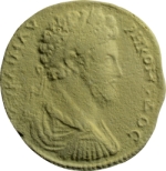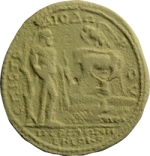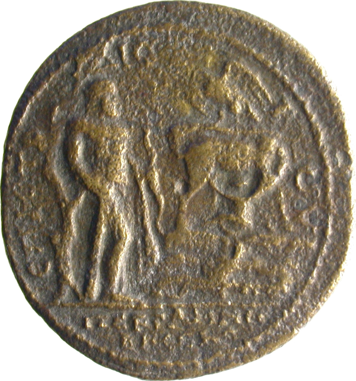 to left, nude Heracles standing, right, leaning against tree, resting arm on club, holding bow and lion skin; to right in background, deer standing, right, head, left, feeding Telephos; above on rock, eagle standing, left, spreading wings |
