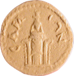 cult statue of Samian Hera standing, facing, wearing kalathos, holding patera in each hand, having fillets; (between two peacocks)