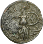 Athena advancing, right, head, left, extending right arm, carrying shield and transverse spear; to left, owl standing, right, to right, serpent coiling, right