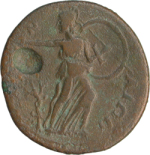 Athena advancing, right, head, left, extending right arm, carrying shield and transverse spear; to left, olive-tree entwined by serpent