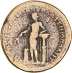nude Apollo standing, facing, head, left, holding branch over altar, resting arm on tripod |