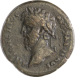 in centre, cult statue of Artemis of Ephesus standing, facing, wearing kalathos, having supports; between two emperors (Marcus Aurelius and Lucius Verus) standing, facing each other, each wearing toga and holding and holding patera