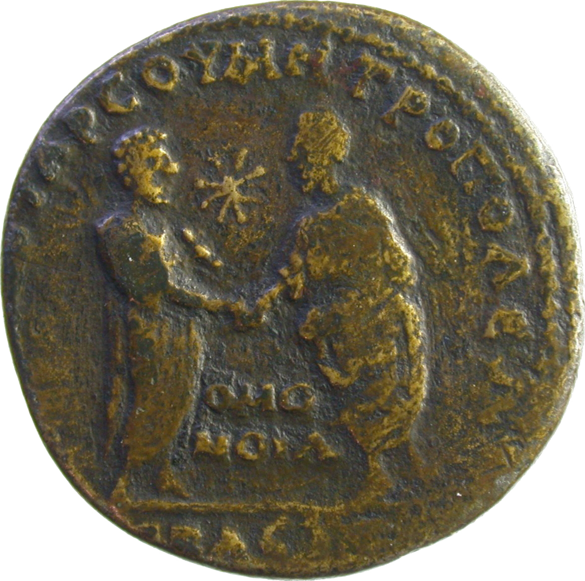 emperors (Marcus Aurelius and Lucius Verus) standing, facing each other, clasping hands, each wearing toga and holding scroll; between them above, star |
