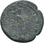cult statue of Apollo (Chresterios) standing on small base, right, holding taenia and laurel-branch |