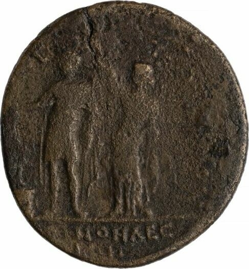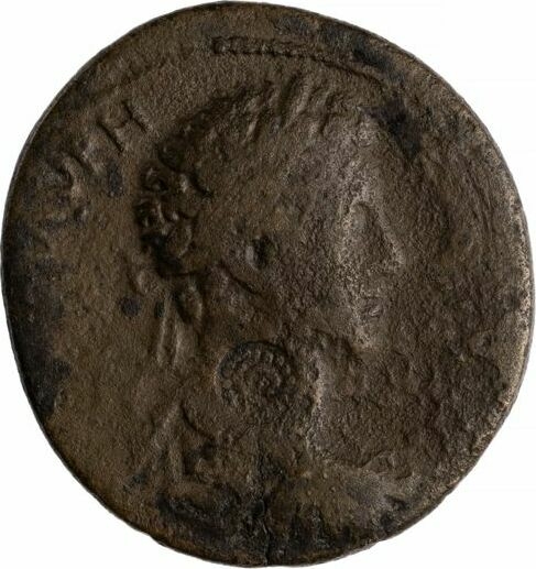 NY: 1953.171.621, obverse heavily tooled into youthful bare-headed bust of Commodus wearing cuirass and paludamentum |