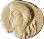 maiden advancing, right, wearing kalathos, brandishing spear, holding bow; to left, stag standing, left, head, right