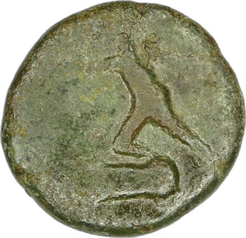 maiden advancing, left, holding bow(?), striking downwards with spear at stag, kneeling, left