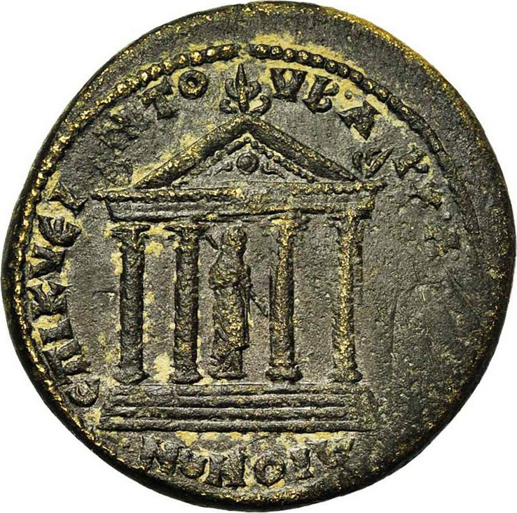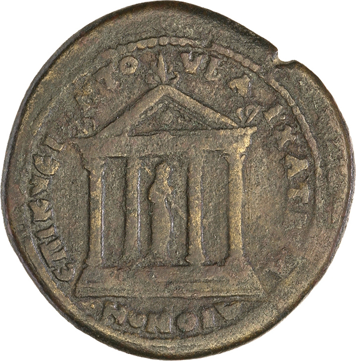 temple with four columns enclosing statue of veiled Hestia, standing, right, holding sceptre over left shoulder |