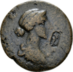 to left, emperor (Marcus Aurelius or Commodus) standing, left, raising right arm; to right, turreted Tyche of Mytilene standing, left, crowning emperor, holding Dionysiac herm
