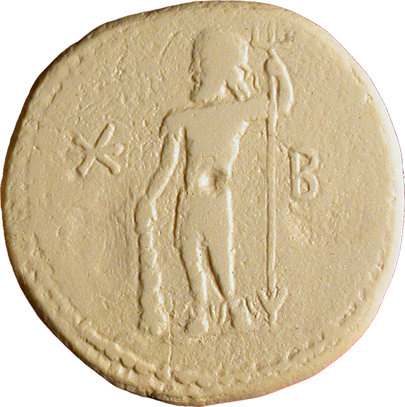 King Sauromates II standing, facing, head, left, resting arm on club, holding trident; to left, star