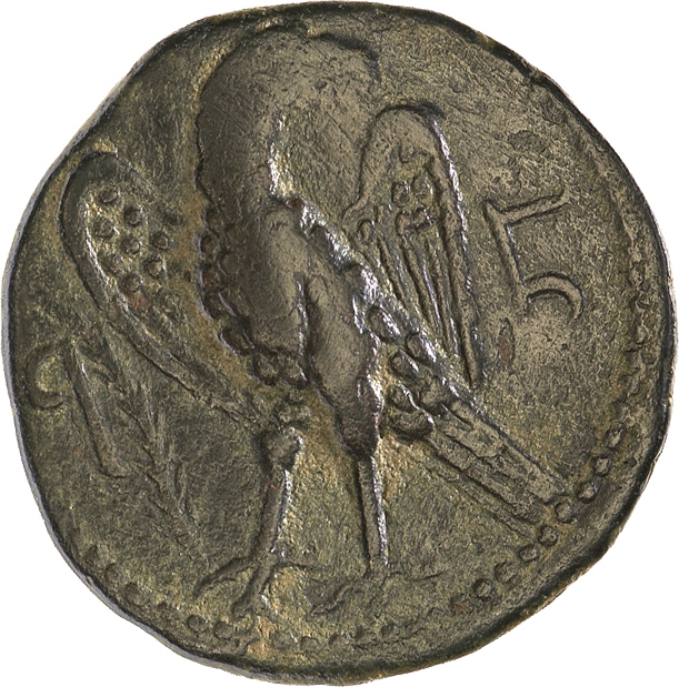 eagle standing, left, head, right, spreading wings, holding wreath in beak; to left, palm-branch