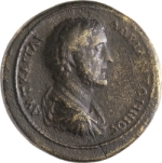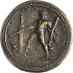 Heracles standing, left, holding long torch, club and lion skin; being held back by two Erotes; in background to left, column surmounted by statue of Demeter with torch and corn ears |