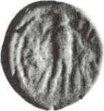nude Heracles standing, facing, head, left, resting arm on club, holding lion skin; to right, Gaza-symbol (mem)