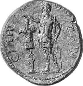 emperor (Lucius Verus) standing, left, wearing military dress, erecting trophy, holding spear