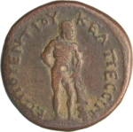 nude Heracles (bearded) standing, right, resting right hand on hip, left arm wrapped in lion skin, resting on club |