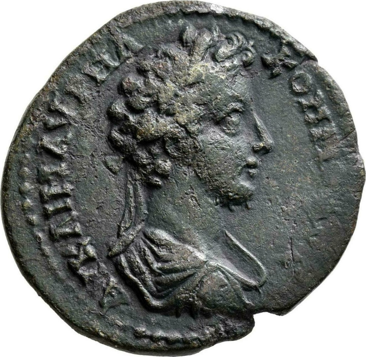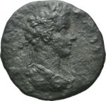 laureate-headed bust of Commodus (short beard) wearing cuirass and paludamentum, right, seen from rear
