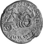 Triptolemus standing in biga drawn by winged serpents, right, sowing with right hand, holding seeds in chlamys |