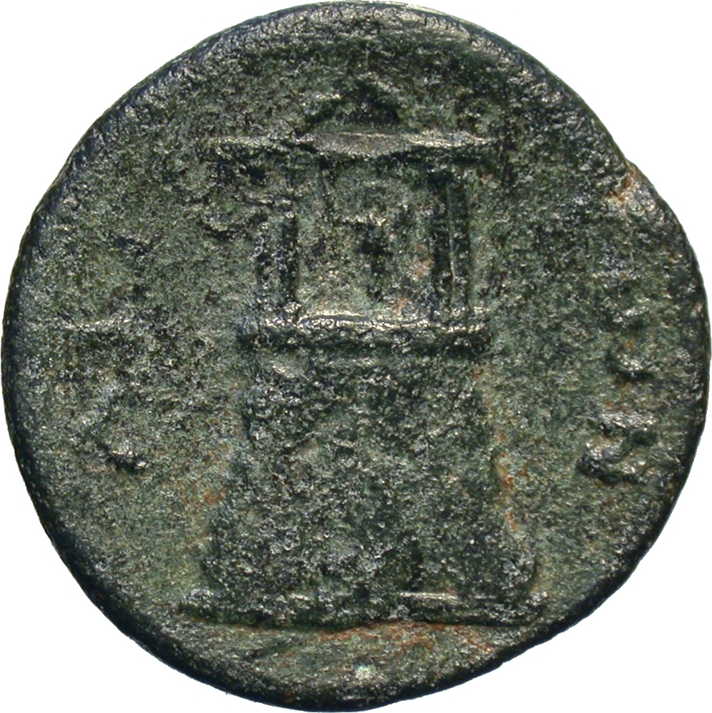 Acropolis-hill surmounted by temple with four columns enclosing statue of Athena (the Palladium) standing, right, brandishing spear, holding shield