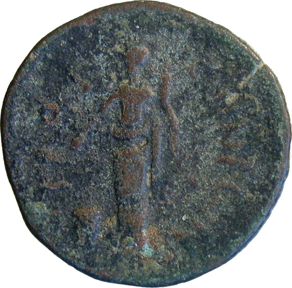 Homonoia standing, left, holding patera over lighted altar and cornucopia