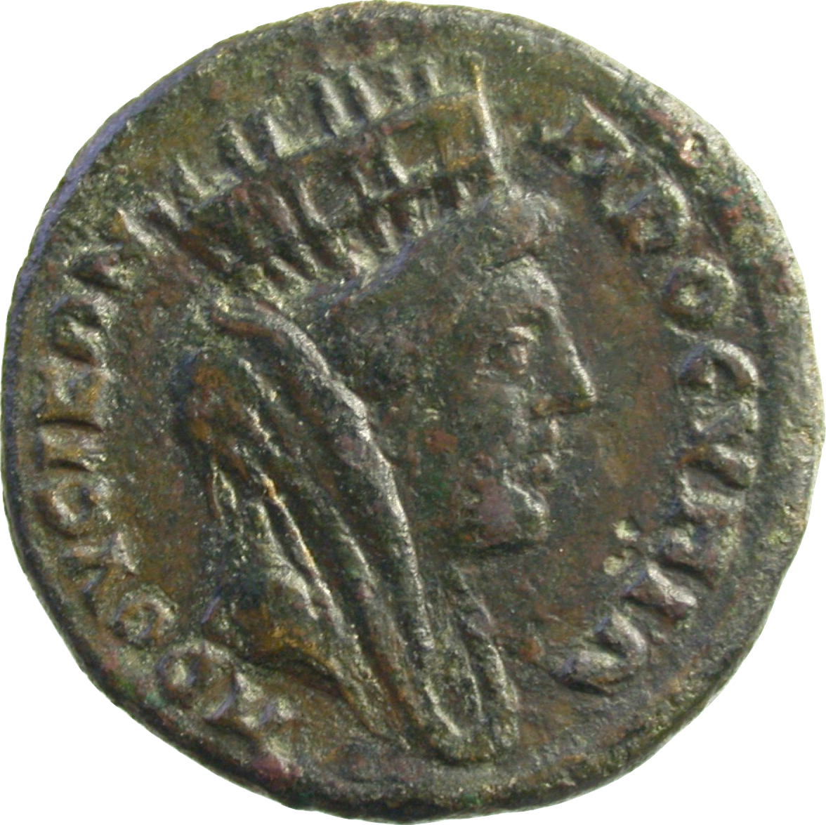 turreted and veiled head of Tyche, right