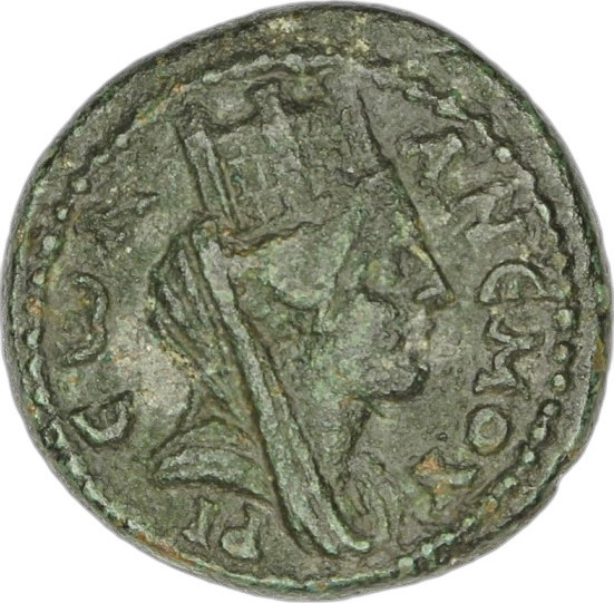 turreted, veiled and draped bust of Tyche (head assimilated to portrait of Faustina II), right