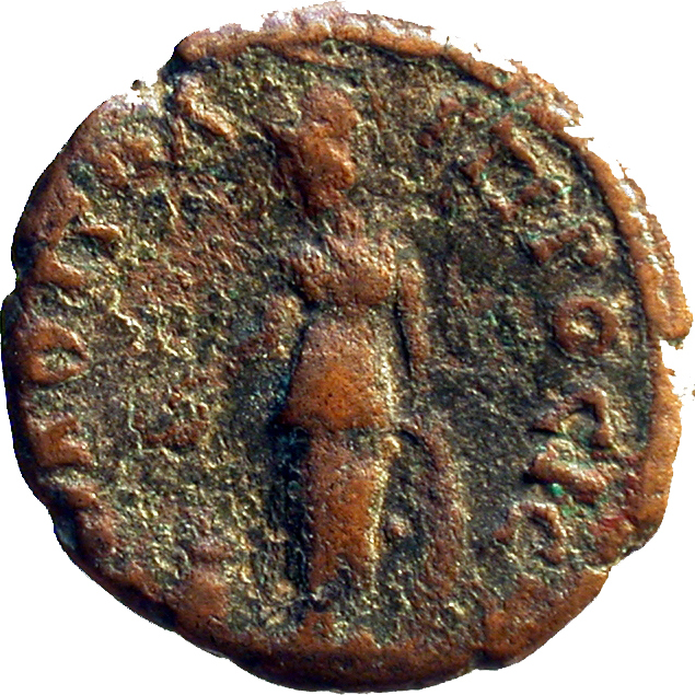 Athena standing facing, head left, holding patera over flaming altar, resting left arm on shield