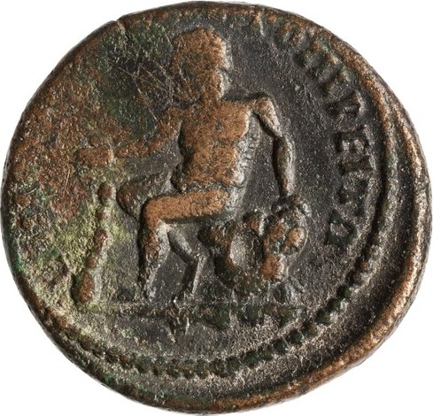 nude Heracles seated on rock covered with lion skin, left, resting right arm on club, resting left arm on rock |
