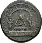 monument of Sandas on base, surmounted by eagle; between two male figures standing, facing monument, each holding palm-branch(?); monument covered by semicircular canopy which rests on male figures' heads |