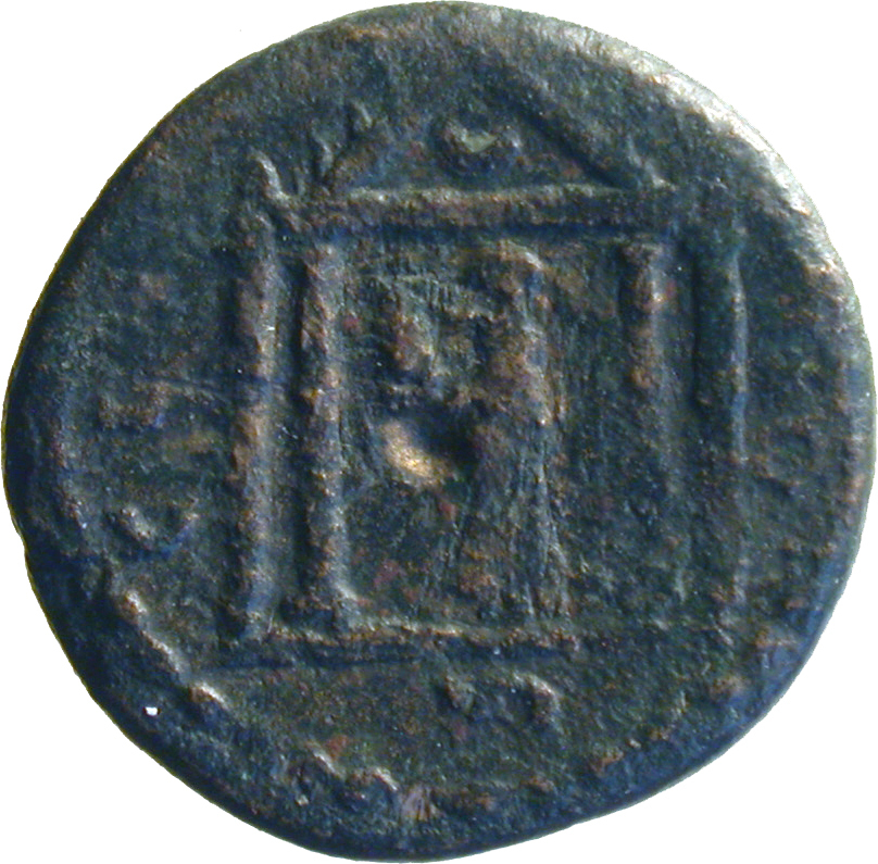 temple of Venus/Aphrodite with four columns on summit of Acrocorinthus enclosing statue of goddess standing, left, holding Mars/Ares' shield before her as mirror