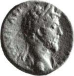 laureate head of Marcus Aurelius with traces of drapery, right