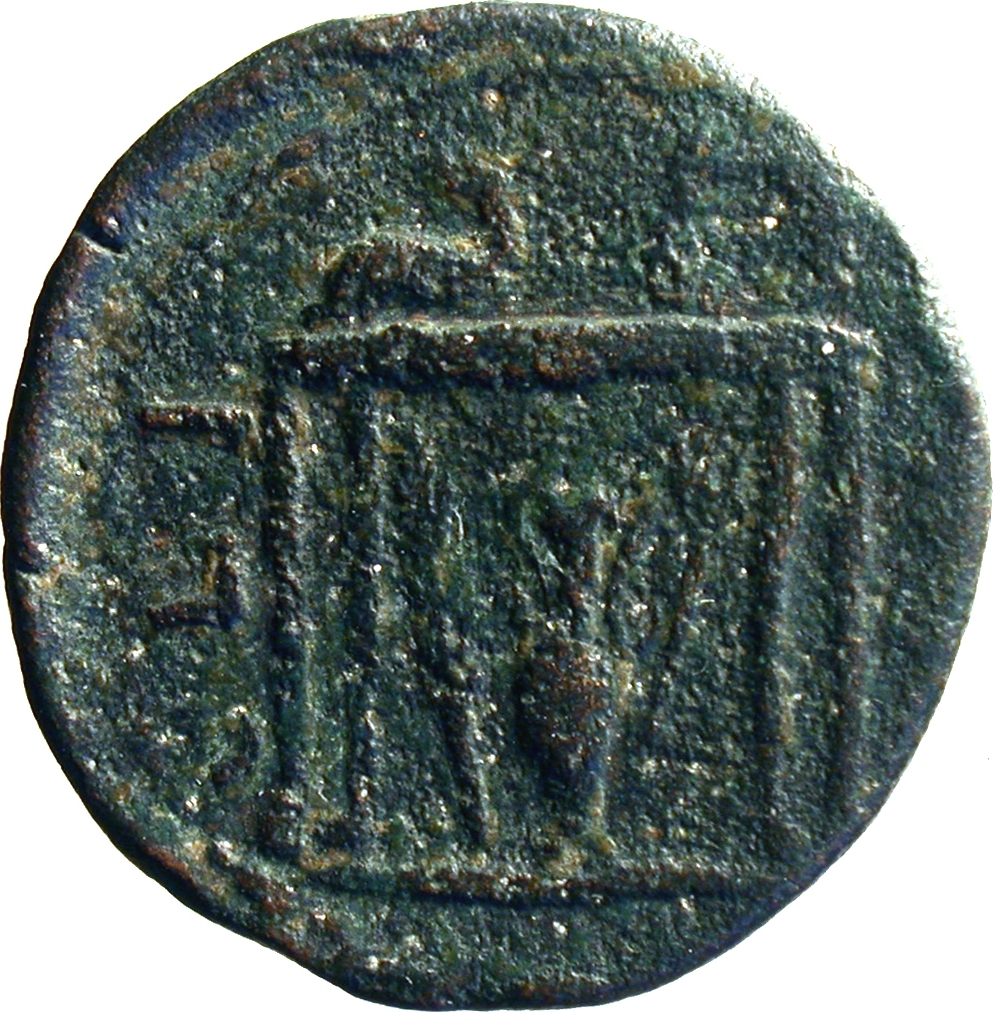 agonistic table with statue of Melikertes-Palaimon lying on back of dolphin and pine wreath; beneath table, amphora between two pine-branches