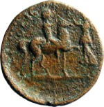 emperor (Marcus Aurelius) on horseback, right, raising left hand; to left, Victoria/Nike standing, left, holding wreath and palm-branch