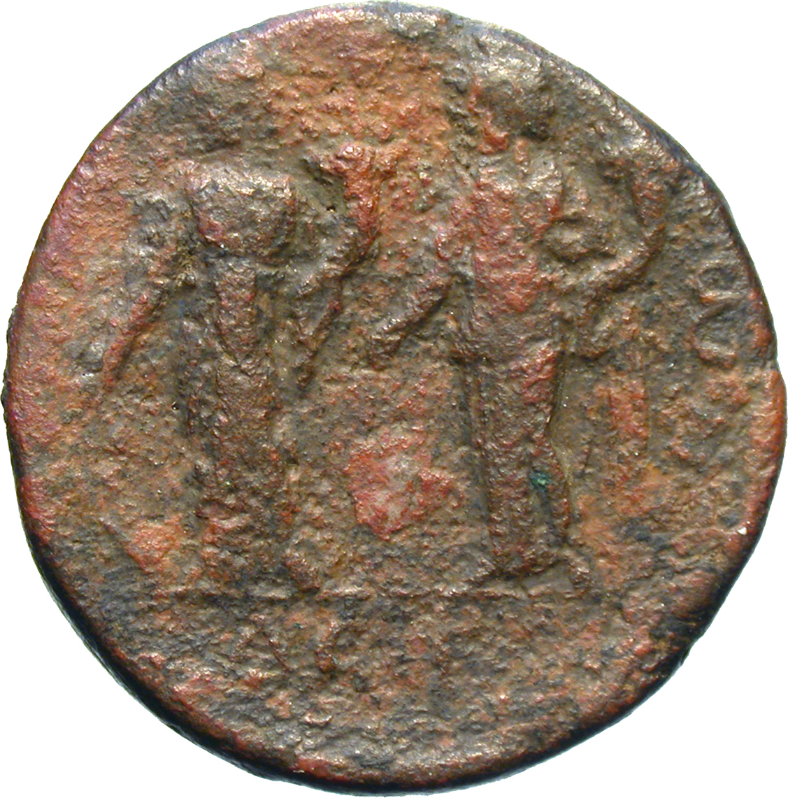 to left, Isis standing, left, wearing basileion, holding rudder and cornucopia; to right, Sarapis standing, left, wearing kalathos, holding cornucopia