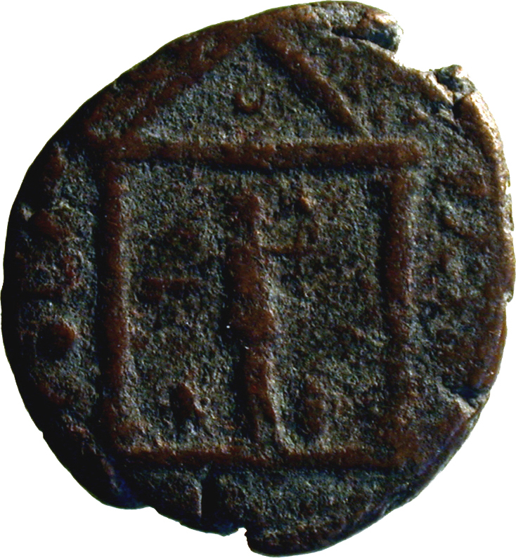 temple with two columns enclosing statue of Minerva/Athena standing, left, holding patera over owl and spear; leaning against spear, shield